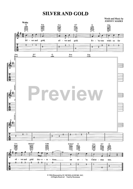 Digital Sheet Music for Silver and Gold by Johnny Marks scored for Easy Guitar Tab/Vocal/Chords; id:463701