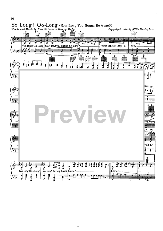 Digital Sheet Music for So Long! Oo-Long (How Long You Gonna Be Gone?) by Bert Kalmar, Harry Ruby scored for Piano/Vocal/Chords; id:423269