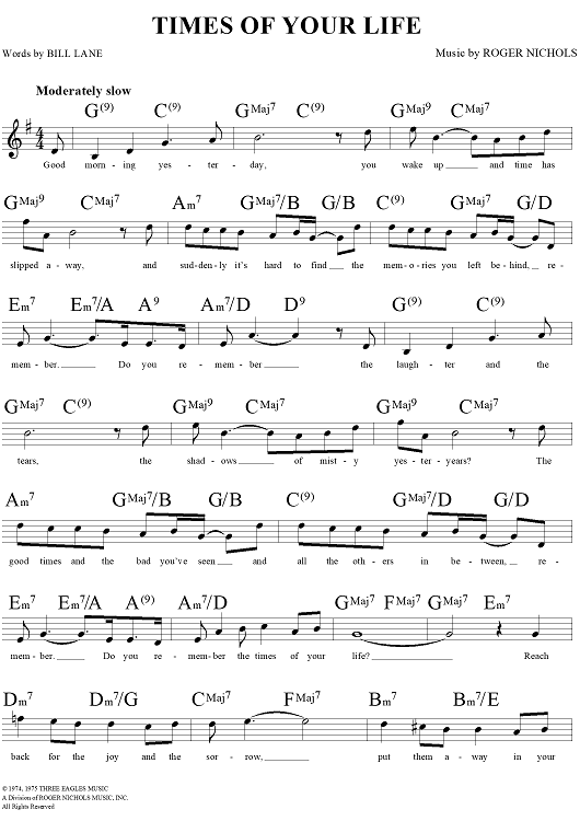 Digital Sheet Music for Times of Your Life by Roger Nichols, Bill Lane, Paul Anka scored for Lead Sheet; id:113096