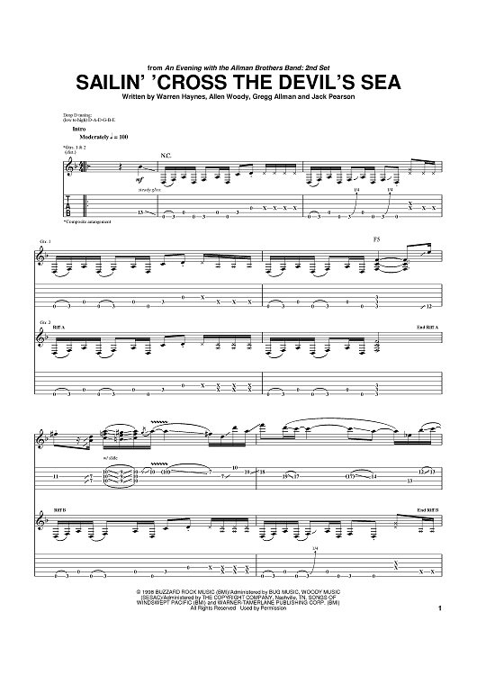Digital Sheet Music for Sailin' 'Cross The Devil's Sea by Gregg Allman, The Allman Brothers Band, Warren Haynes, Allen Woody scored for Guitar Tab; id:371541