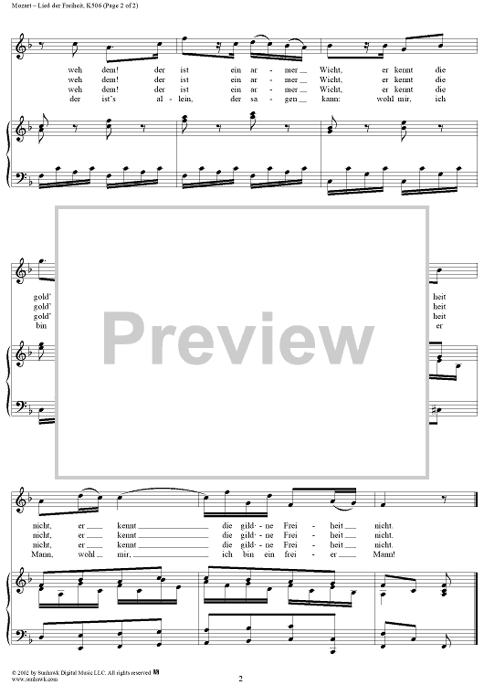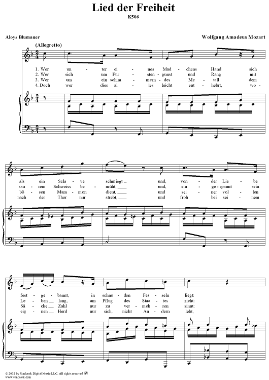 Digital Sheet Music for Lied der Freiheit: "Wer unter eines Mädchens Hand", K506 by Wolfgang Amadeus Mozart, Aloys Blumauer scored for Voice/Piano; id:291345