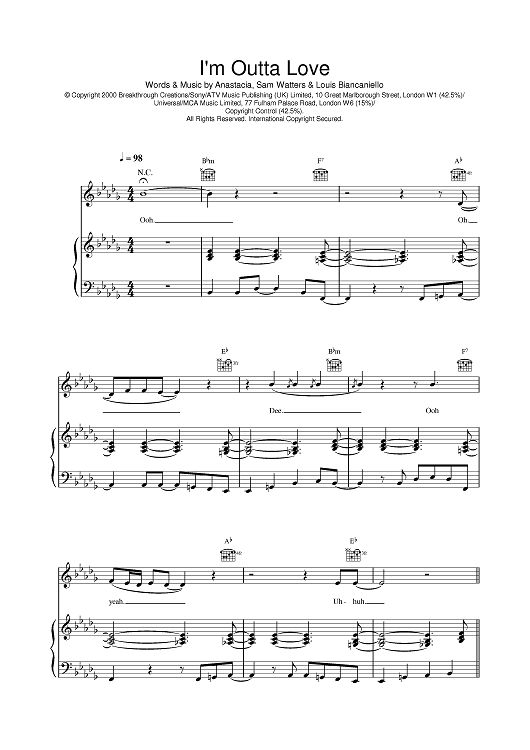 Digital Sheet Music for I'm Outta Love by Anastacia scored for Piano/Vocal/Chords; id:377144