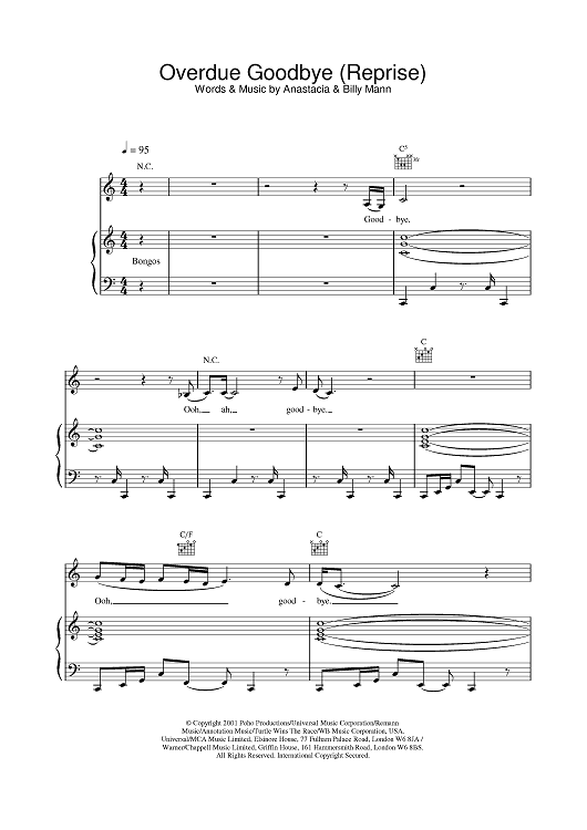Digital Sheet Music for Overdue (reprise) by Billy Mann, Anastacia scored for Piano/Vocal/Chords; id:382623