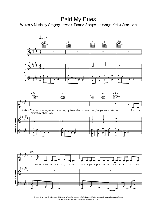 Digital Sheet Music for Paid My Dues by Damon Sharpe, Anastacia, Lamenga Kafi, Greg Lawson scored for Piano/Vocal/Chords; id:382621