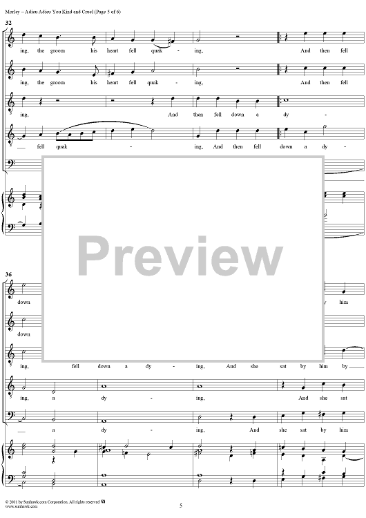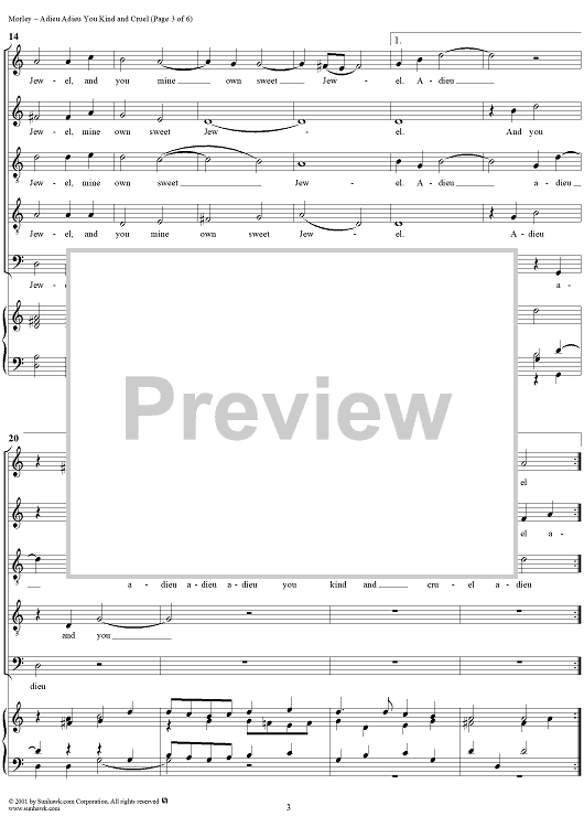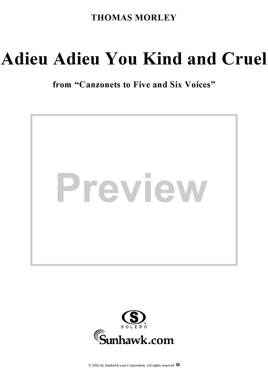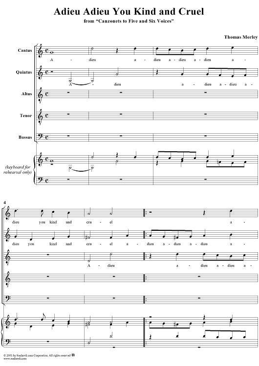 Digital Sheet Music for Adieu Adieu You Kind and Cruel by Thomas Morley scored for Five-part Mixed Chorus; id:259781