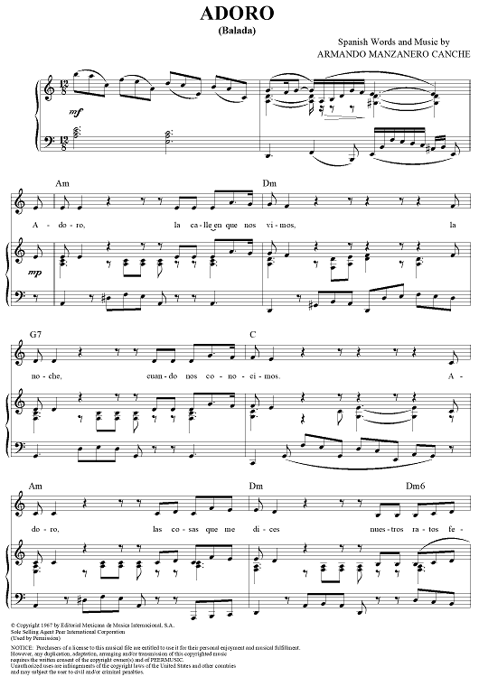 Digital Sheet Music for Adoro by Armando Manzanero, Vikki Carr scored for Piano/Vocal/Chords; id:355902