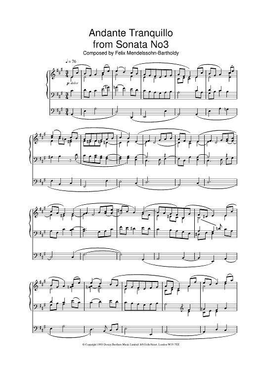"Andante Tranquillo from Sonata No3" Sheet Music by Felix Mendelssohn
