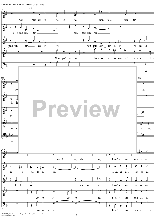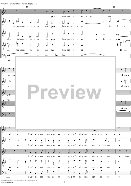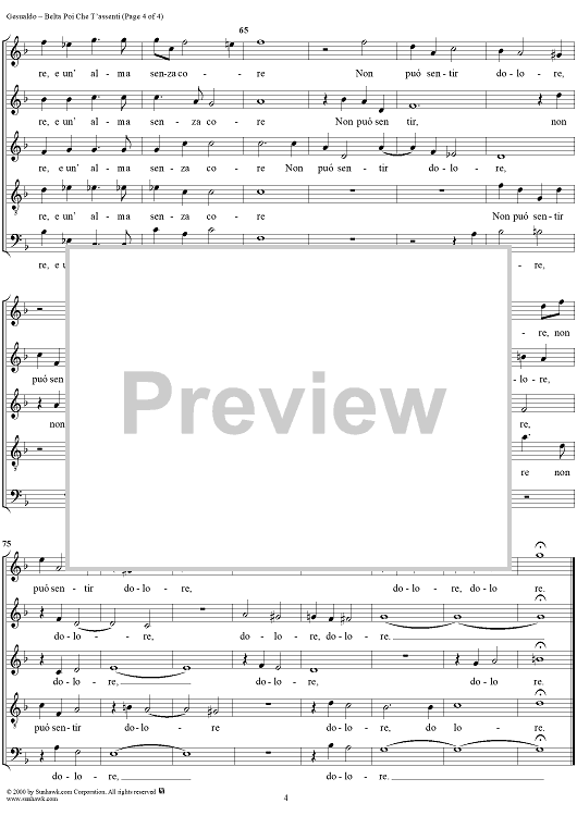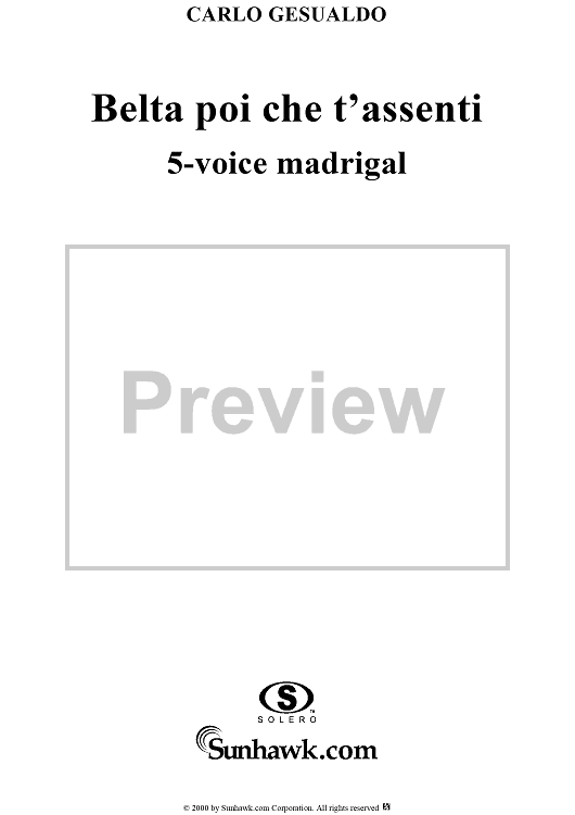 Digital Sheet Music for Belta poi che t'assenti (5-voice madrigal) by Carlo Gesualdo scored for Four-part Mixed Chorus; id:267778