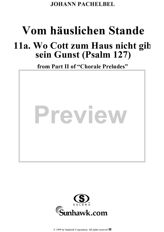 Digital Sheet Music for Chorale Preludes, Part II, Vom häuslichen Stande, 11a. Wo Gott zum Haus nicht gibt sein Gunst (Psalm 127) by Johann Pachelbel scored for Organ Solo; id:254111