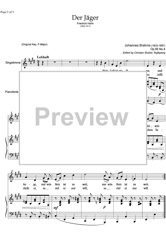 Digital Sheet Music for Der Jäger Op.95 No. 4 by , Johannes Brahms scored for Soprano or Tenor/Piano; id:338148