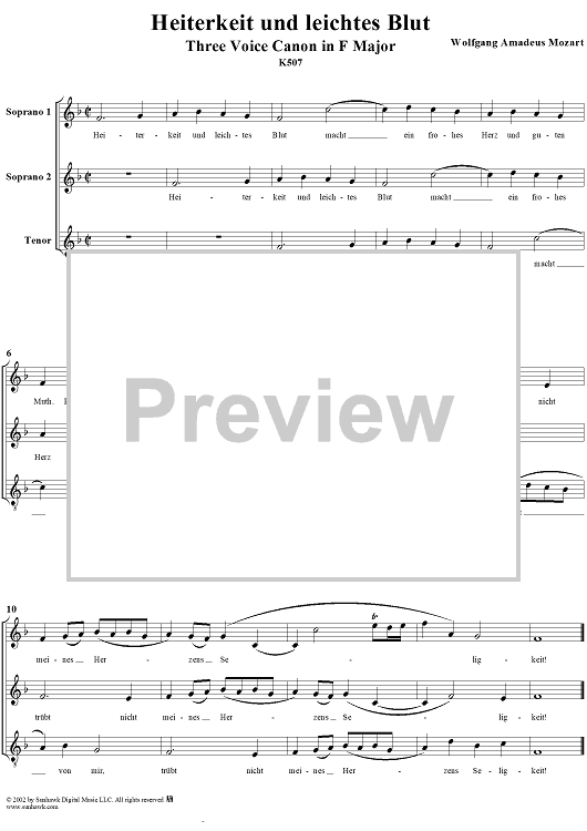 "Heiterkeit und leichtes Blut, three voice canon in F Major, K507" Sheet Music by Wolfgang Amadeus Mozart