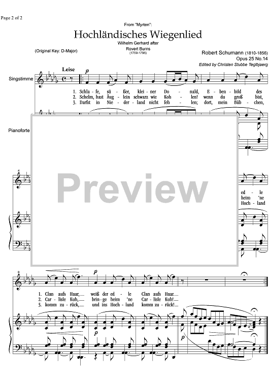 Digital Sheet Music for Hochländisches Wiegenlied Op.25 No.14 by Robert Schumann scored for Soprano or Tenor/Piano; id:332498