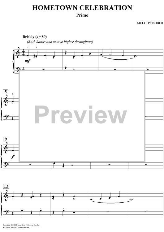 The thrill of making music with a friend or teacher is captured in this new series of duets. Written with the beginning piano student in mind, the pieces in this collection have a limited reading and playing range. Both primo and secondo parts are equal in difficulty and usually stay in one position throughout the piece. A variety of keys, styles, meters and tempos are featured. Titles: Back and Forth Waltz * Dance Class * Hometown Celebration * Hot Popcorn! * Listen to the Wind * A Mysterious Adventure * Race Car Boogie * Twilight Tune. "Dance Class," "Hot Popcorn!," "Listen to the Wind," and "Race Car Boogie" are Federation Festivals 2016-2020 selections.