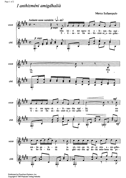 Digital Sheet Music for I anthizméni amigdhalià by Marco Sofianopulo scored for Voice/Guitar; id:330510
