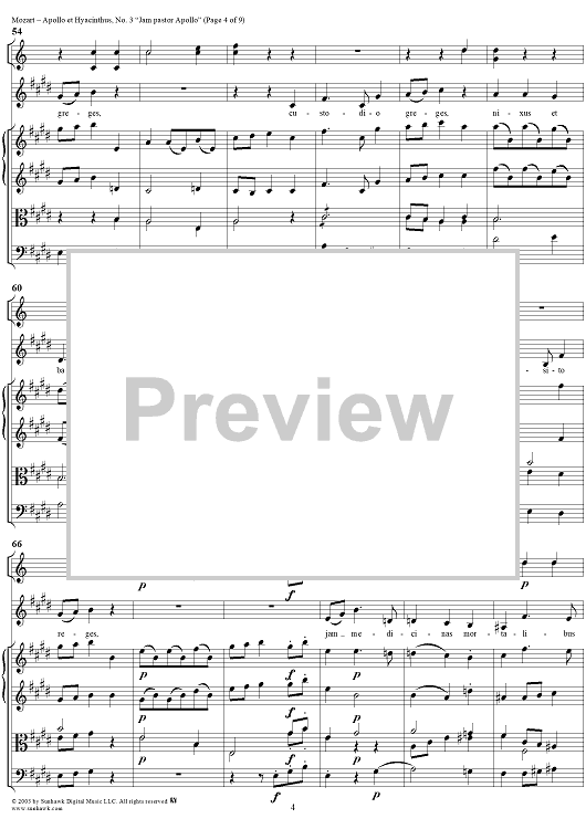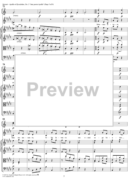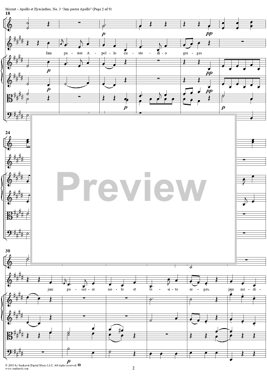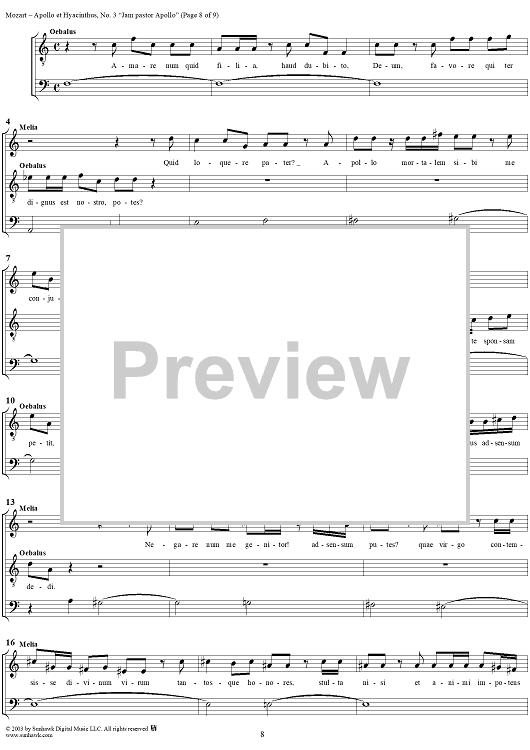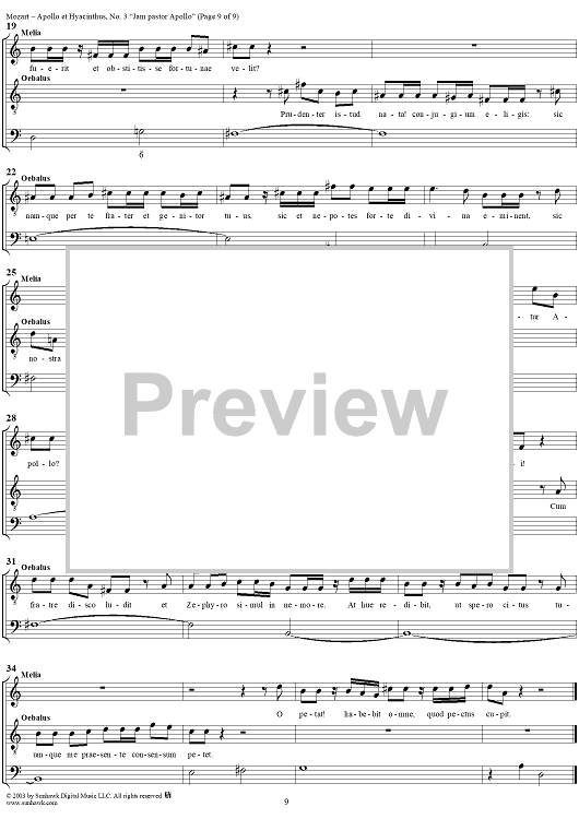 Digital Sheet Music for "Iam pastor Apollo", No. 3 from "Apollo et Hyacinthus" (K38) - Full Score by Wolfgang Amadeus Mozart scored for Voice and Orchestra; id:291759