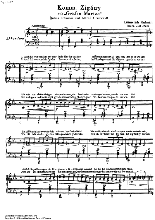 Digital Sheet Music for Komm, Zigány by , Emmerich Kalman, Curt Mahr scored for Accordion; id:337636