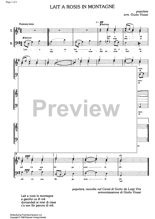"Lait a rosis in montagne" Sheet Music by Traditional