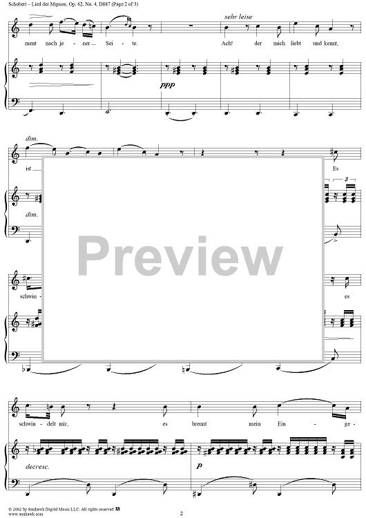 Digital Sheet Music for Lied der Mignon IV, Op.62, No.4, D877 by Franz Schubert scored for Voice/Piano; id:256706