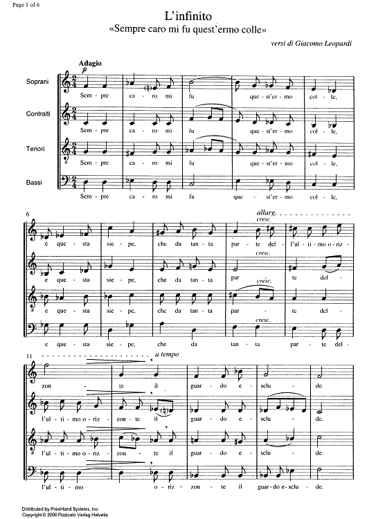 Digital Sheet Music for L'infinito Sempre caro mi fu quest'ermo colle by , Piero Pezzè scored for SATB Choir; id:335201