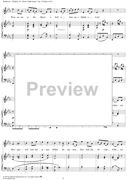 Digital Sheet Music for Mailied, No. 4 from "Eight Songs", Op. 52 by Ludwig van Beethoven, Johann Wolfgang von Goethe scored for Voice/Piano; id:315428