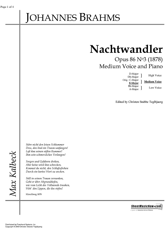 Digital Sheet Music for Nachtwandler Op.86 No. 3 by , Johannes Brahms scored for Mezzo-soprano or Baritone/Piano; id:338135
