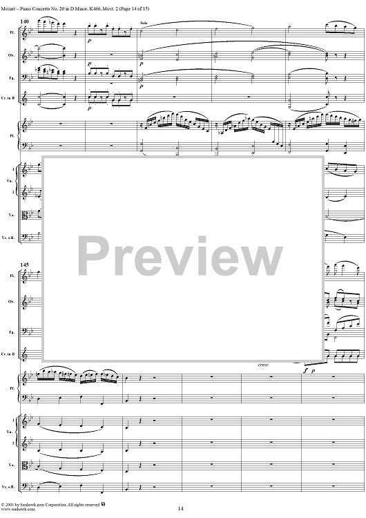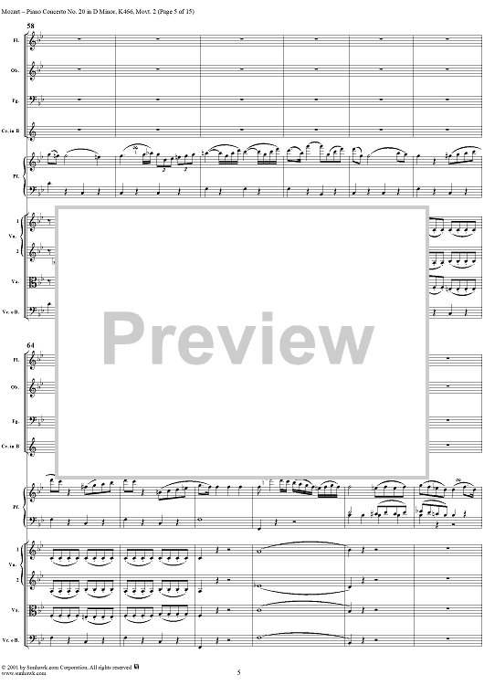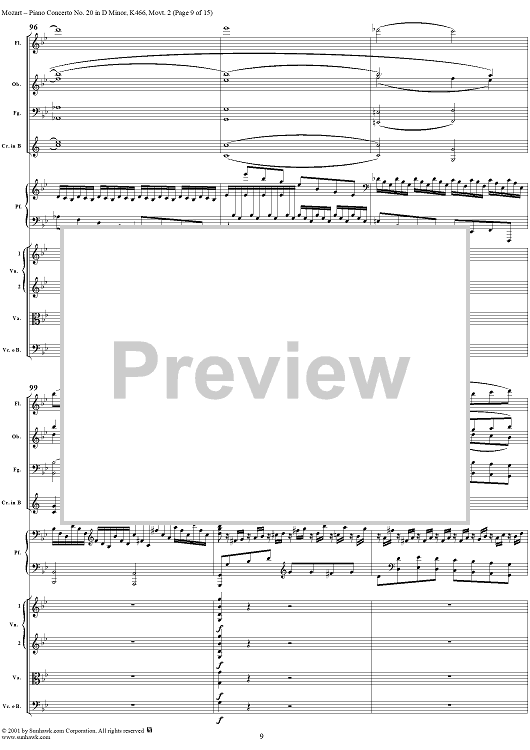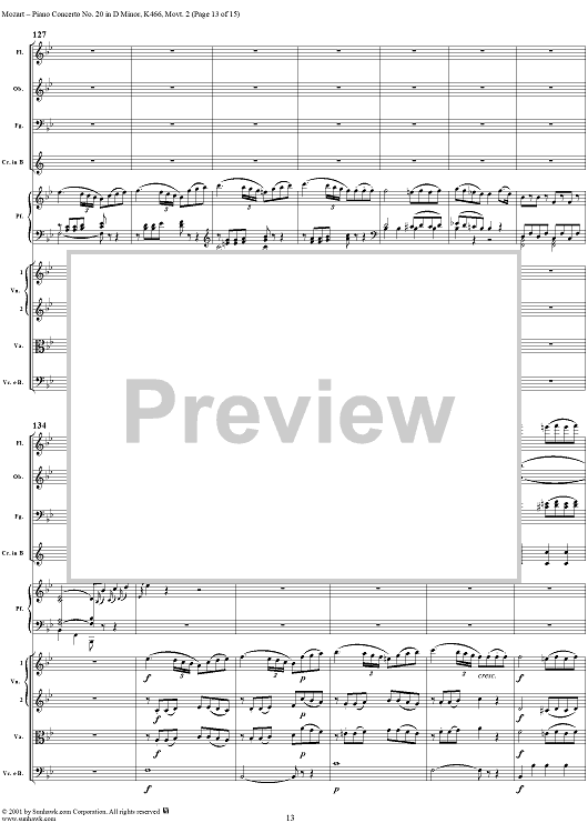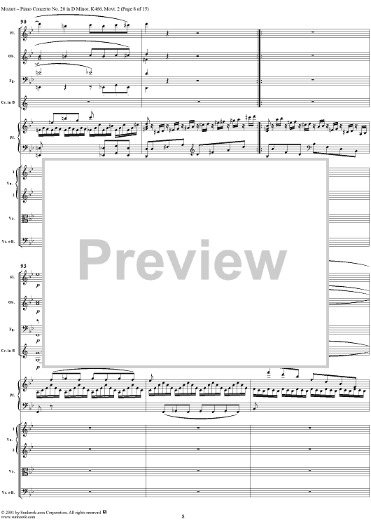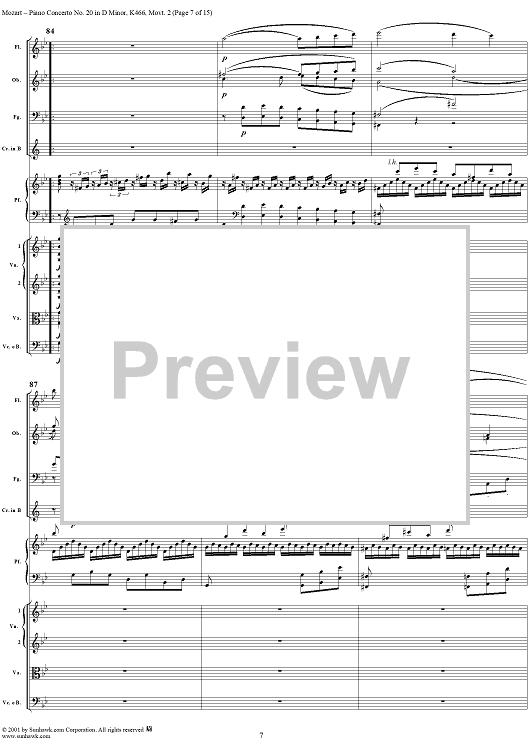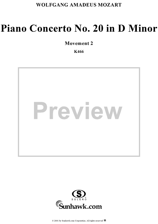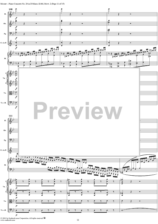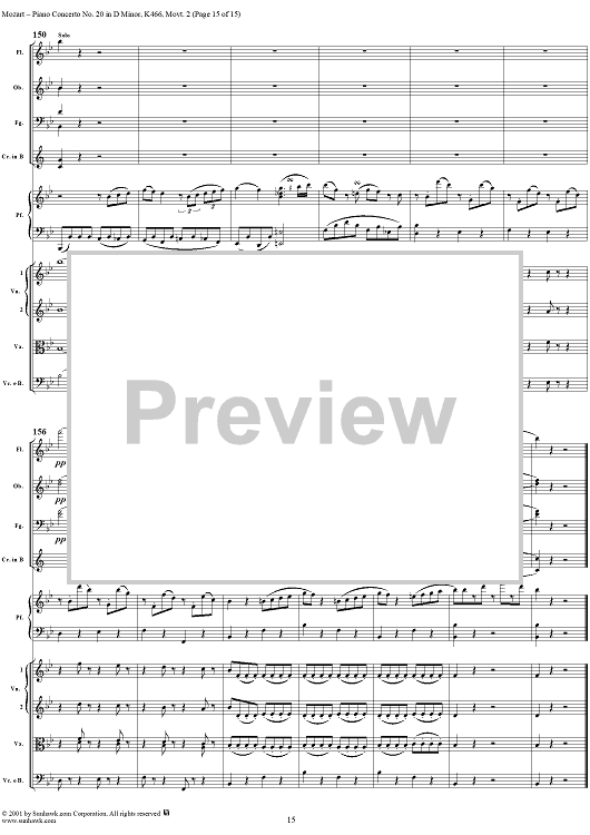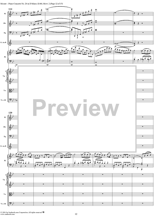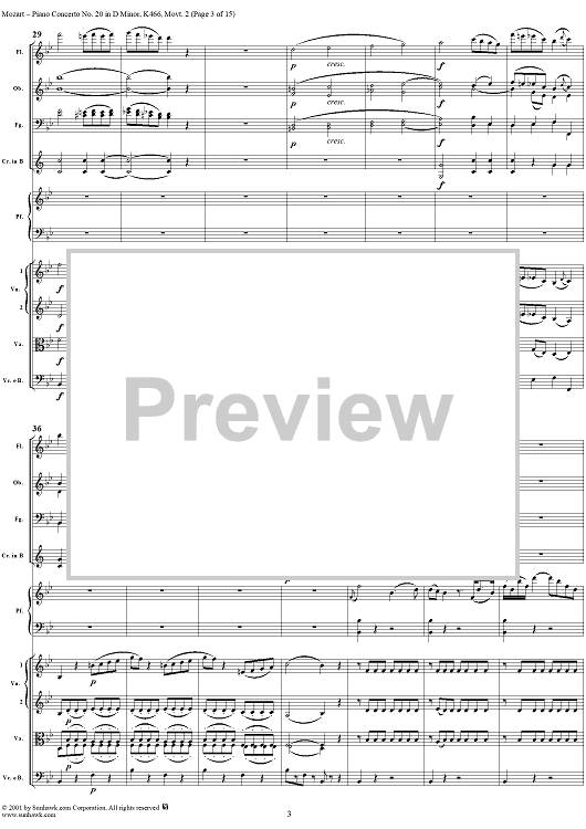 Digital Sheet Music for Piano Concerto No. 20 in D Minor, Movement 2 (K466) - Full Score by Wolfgang Amadeus Mozart scored for Piano and Orchestra; id:253196