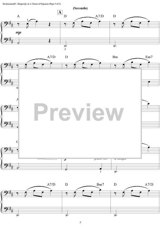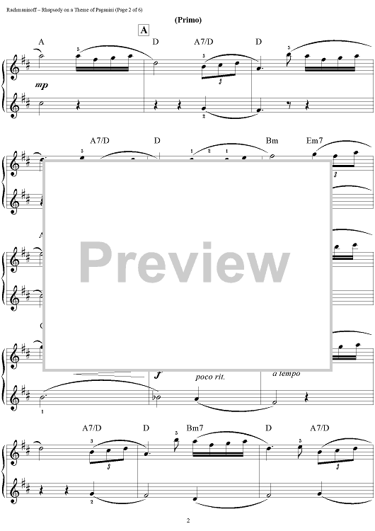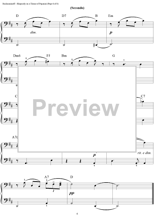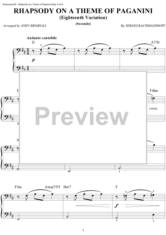 Digital Sheet Music for Rhapsody on a Theme of Paganini (18th var.) by John Brimhall, Sergei Rachmaninoff scored for Easy Piano, 4 Hands; id:255594