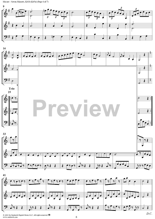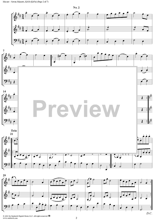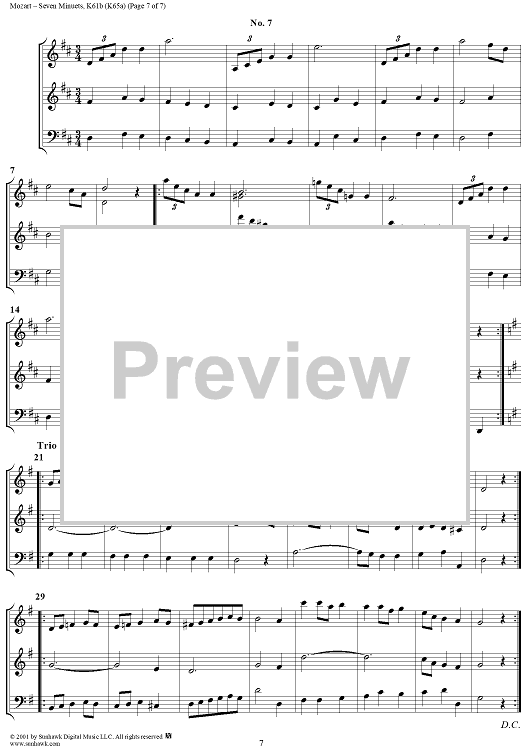 Digital Sheet Music for Seven Menuette, K61b (K65a) by Wolfgang Amadeus Mozart scored for String Trio; id:265545