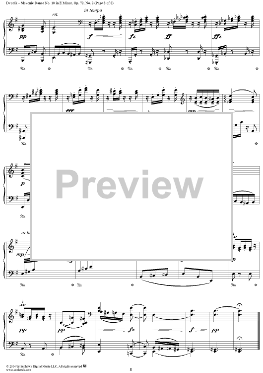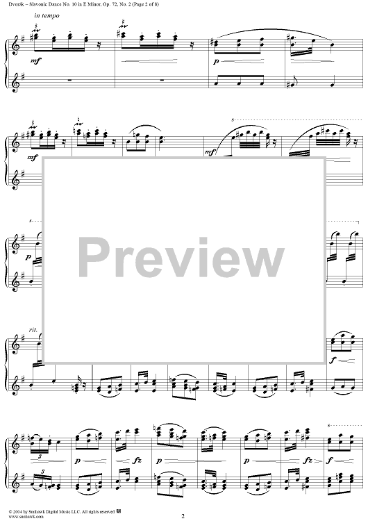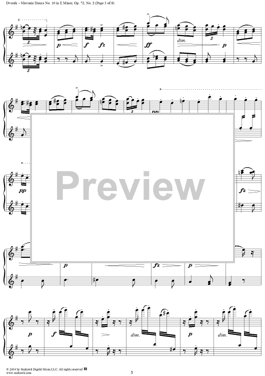 Digital Sheet Music for Slavonic Dance No. 10 in E Minor, Op. 72, No. 2 by Antonín Dvorák scored for 1 Piano, 4 Hands; id:294656