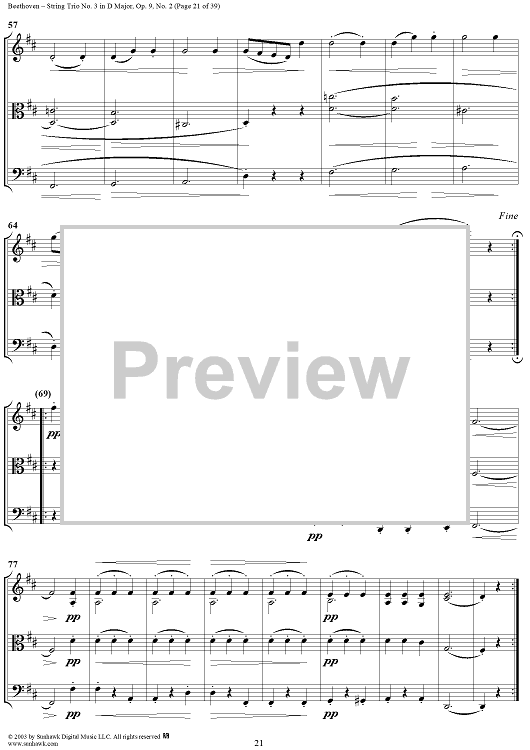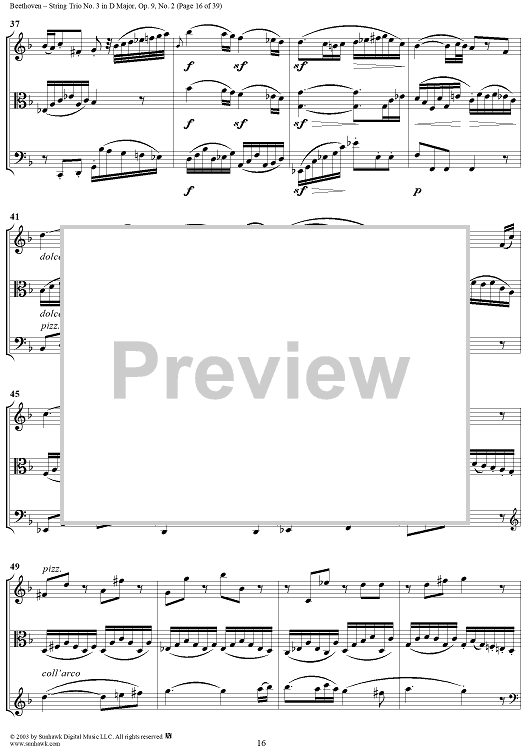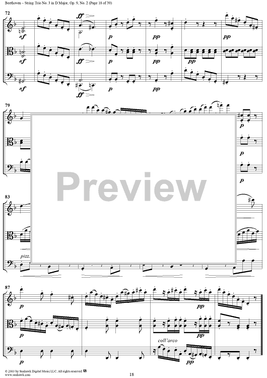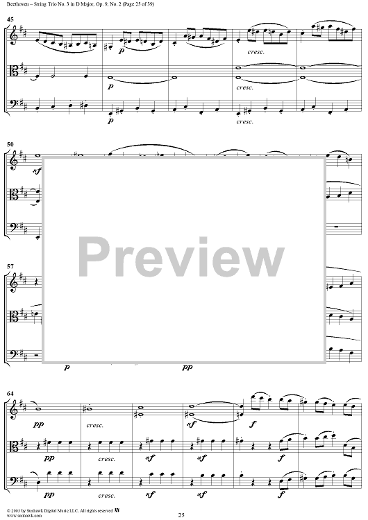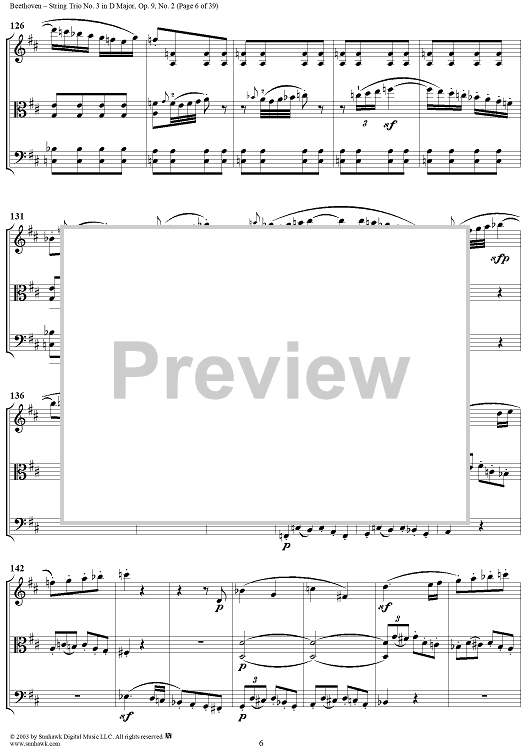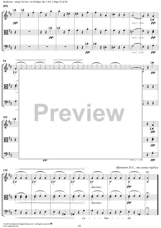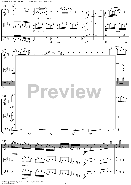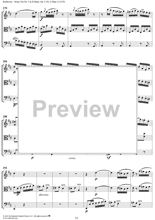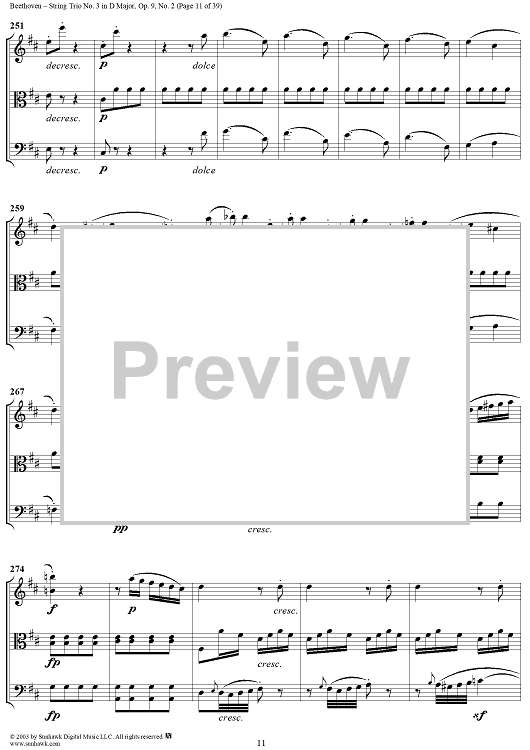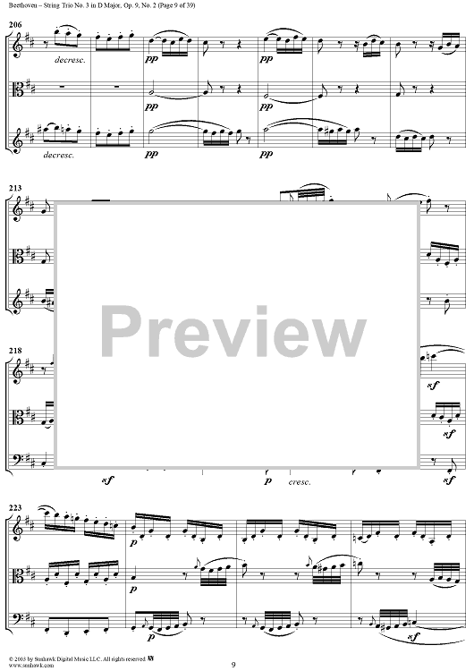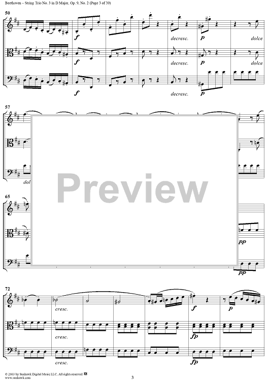 Digital Sheet Music for String Trio No. 3 in D Major Op. 9, No. 2 - Score by Ludwig van Beethoven scored for String Trio; id:275280
