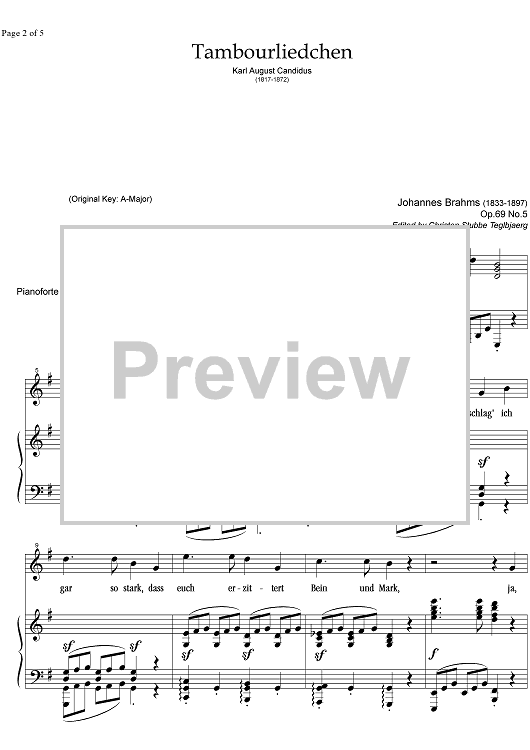 Digital Sheet Music for Tambourliedchen Op.69 No. 5 by , Johannes Brahms scored for Soprano or Tenor/Piano; id:336047