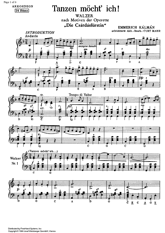 Digital Sheet Music for Tanzen möcht' ich! from Die Csardasfürstin by , Emmerich Kalman, Curt Mahr scored for Accordion; id:337635