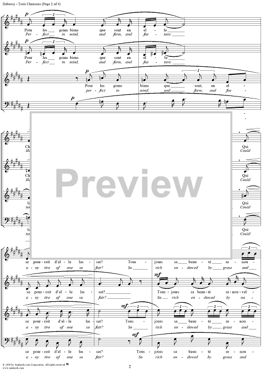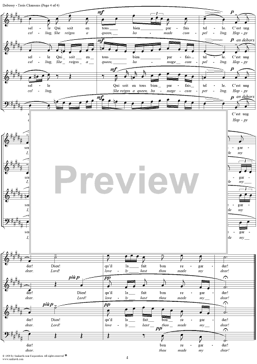 Digital Sheet Music for Trois Chansons, I. Dieu! Qu'il la fait bon regarder!, Lord! Lovely hast thou made my dear by Claude Debussy scored for Four-part Mixed Chorus; id:271707