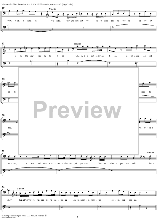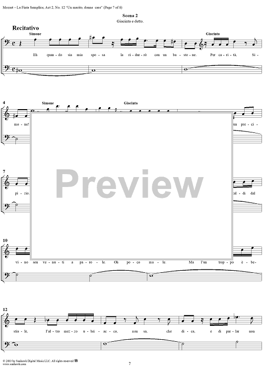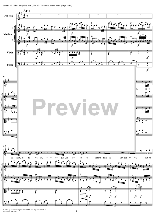 Digital Sheet Music for "Un marito, donne care", No. 12 from "La Finta Semplice", Act 2, K46a (K51) - Full Score by Wolfgang Amadeus Mozart scored for Voice and Orchestra; id:291811
