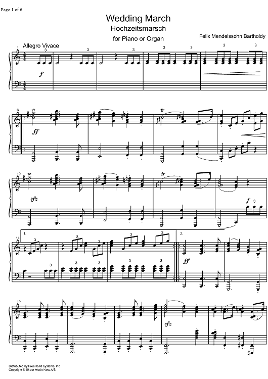 Digital Sheet Music for Wedding March by Felix Mendelssohn, SMN Archive Collection scored for Organ or Piano; id:324597