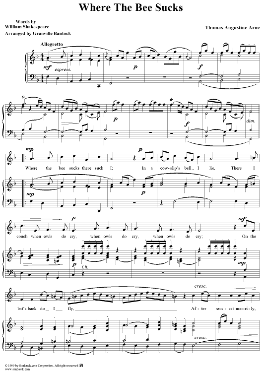 Digital Sheet Music for Where the Bee Sucks by Thomas Arne, Granville Bantock, William Shakespeare scored for Piano/Vocal; id:119429