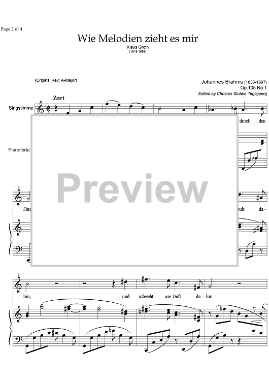 Digital Sheet Music for Wie Melodien zieht es mir Op.105 No. 1 by , Johannes Brahms scored for Soprano or Tenor/Piano; id:331295