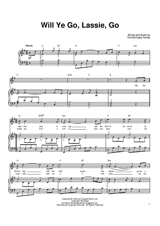 Digital Sheet Music for Will Ye Go, Lassie, Go by The McPeake Family, Ronan Tynan scored for Piano/Vocal/Chords; id:385207