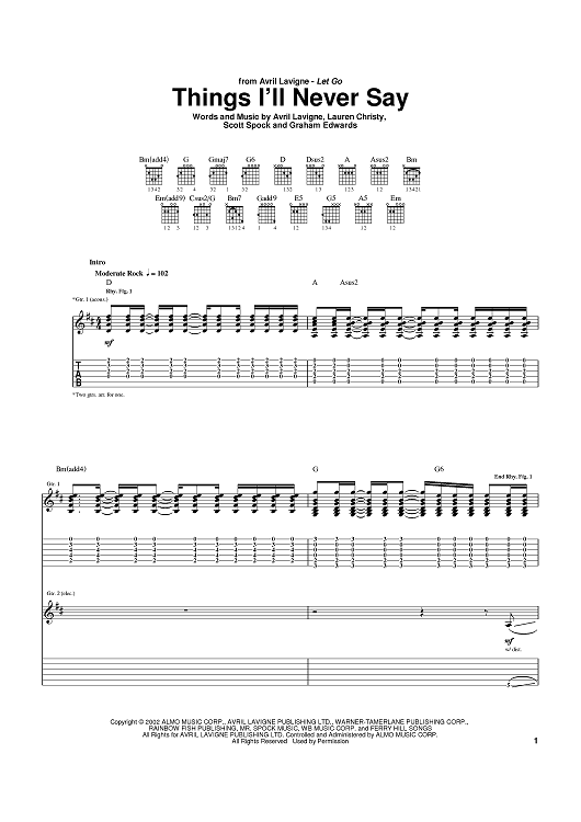 Digital Sheet Music for Things I'll Never Say by Lauren Christy, Avril Lavigne, Scott Spock scored for Guitar Tab; id:371527