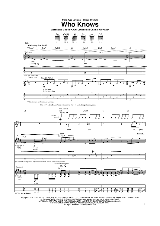 Digital Sheet Music for Who Knows by Avril Lavigne, Chantal Kreviazuk scored for Guitar Tab; id:379542