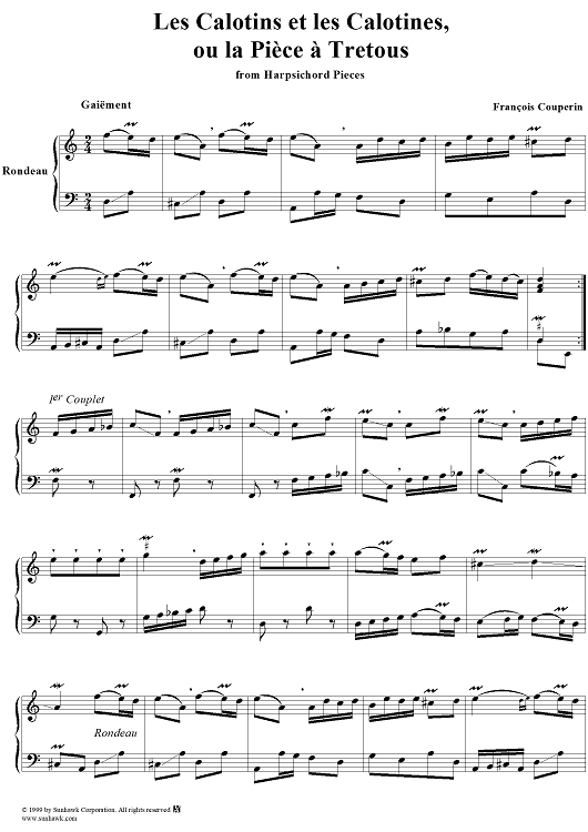Digital Sheet Music for Harpsichord Pieces, Book 3, Suite 19, No. 1: Les Calotins et les Calotines, ou la Pièce à tretous by Francois Couperin scored for Piano Solo; id:272240