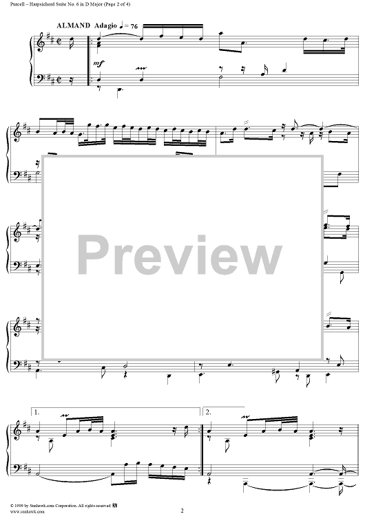Digital Sheet Music for Suite No. 6 in D Major by Henry Purcell scored for Piano Solo; id:255066