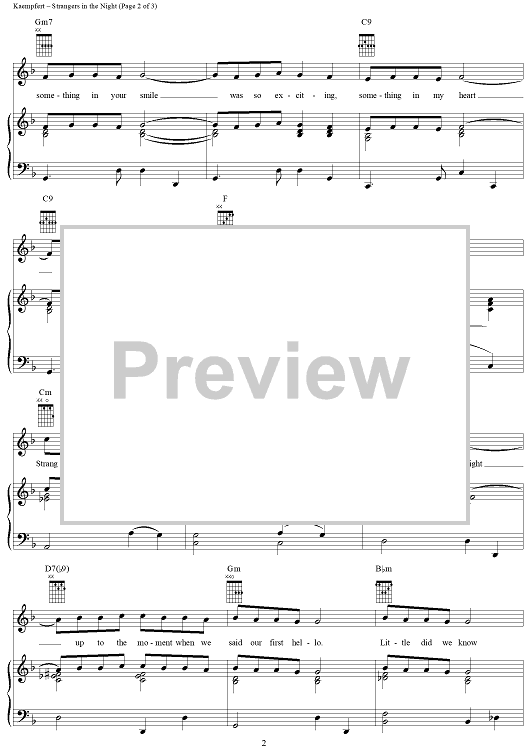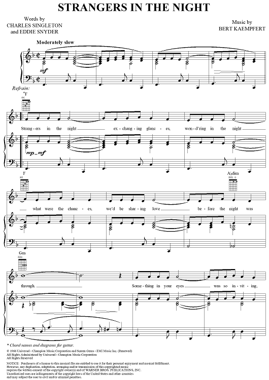 Digital Sheet Music for Strangers in the Night by Frank Sinatra, Eddie Snyder, Bert Kaempfert, Charles Singleton scored for Piano/Vocal/Chords; id:289836