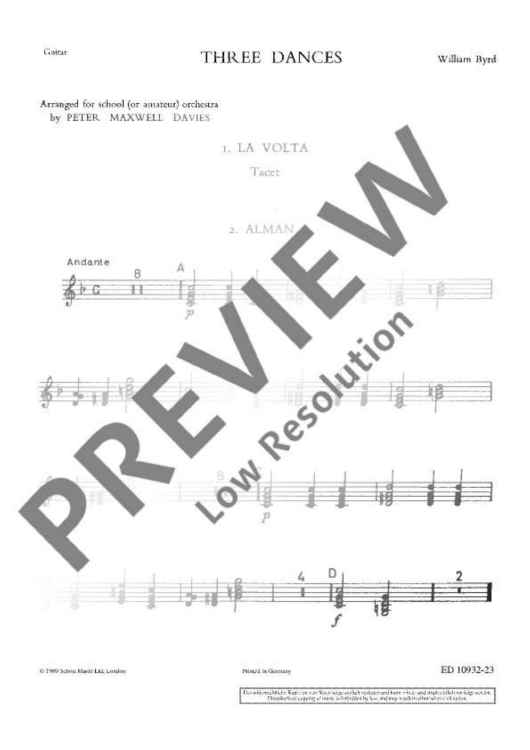 Digital Sheet Music for 3 Dances - Guitar by William Byrd scored for School Orchestra; id:474290