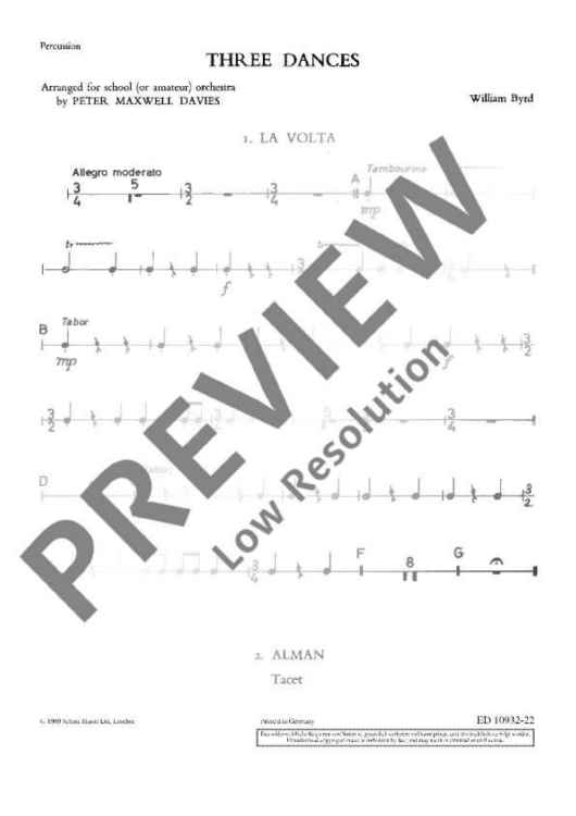 Digital Sheet Music for 3 Dances - Percussion by William Byrd scored for School Orchestra; id:474289
