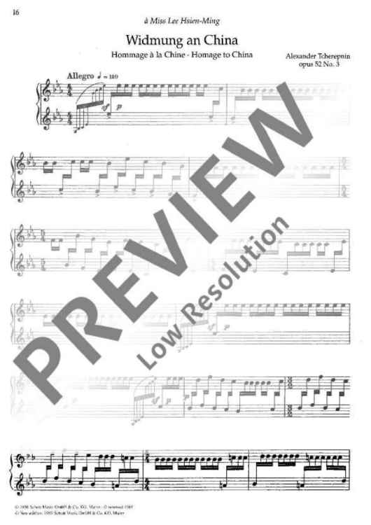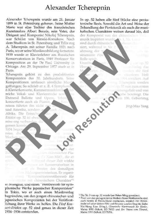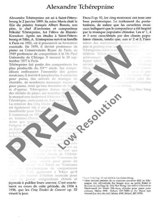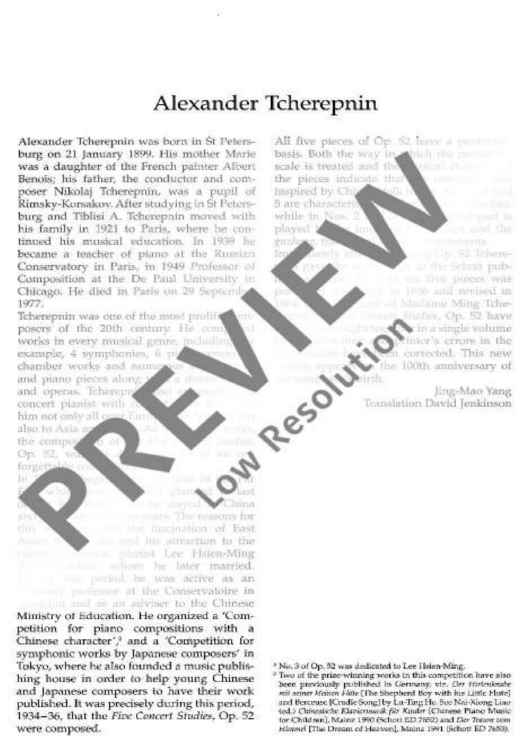 Tcherepnin composed these five pieces during a sojourn in Shanghai, were he was honorary professor at the conservatory and also worked as a consultant for the Chinese ministry of education. The studies were inspired by Chinese folk music and are based on pentatonic scales.