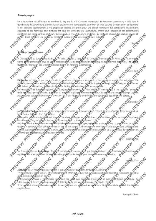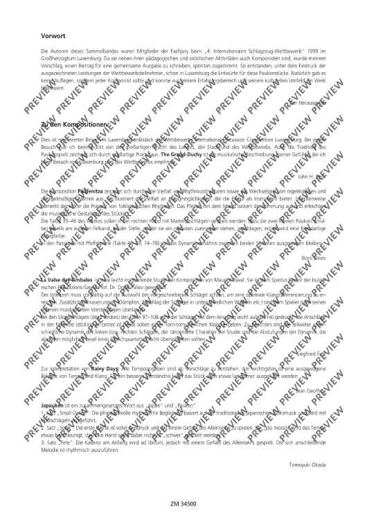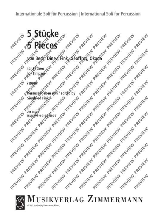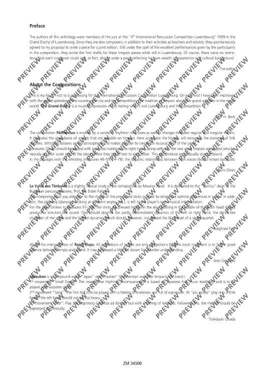 The authors of this collection were members of the jury at the "4th International percussion competition" 1999 in Luxembourg. The compositions presented here were written under the impression of the excellent performance of the participants - on the initiative of Siegfrid Fink. All of them are on a high technical level and offer complex possibilites to advanced timpani players.