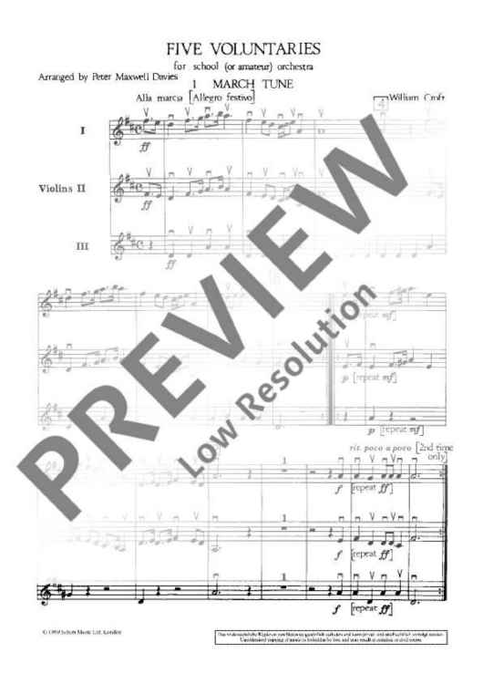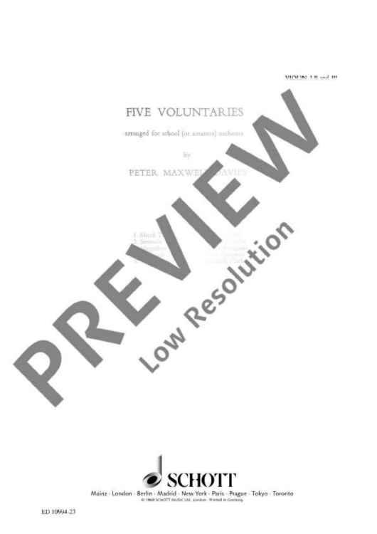 These 5 short voluntaries are arrangements of Jeremiah Clarke, William Croft, Pierre Attaignant and Louis Couperin. They make lively and interesting pieces suitable for youth orchestras or school orchestras of high standard.