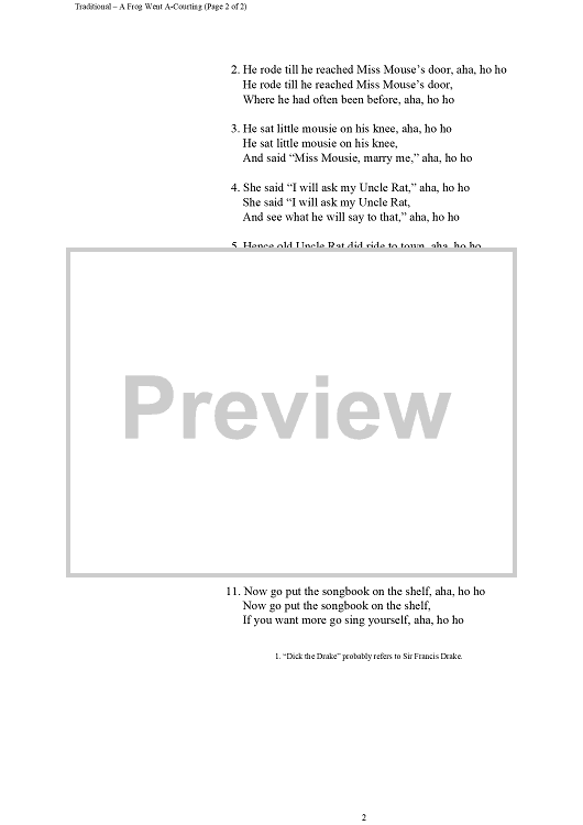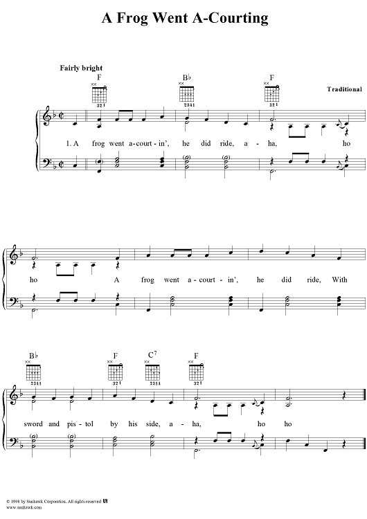 Digital Sheet Music for A Frog Went A-Courting by Traditional scored for Piano/Vocal; id:111419