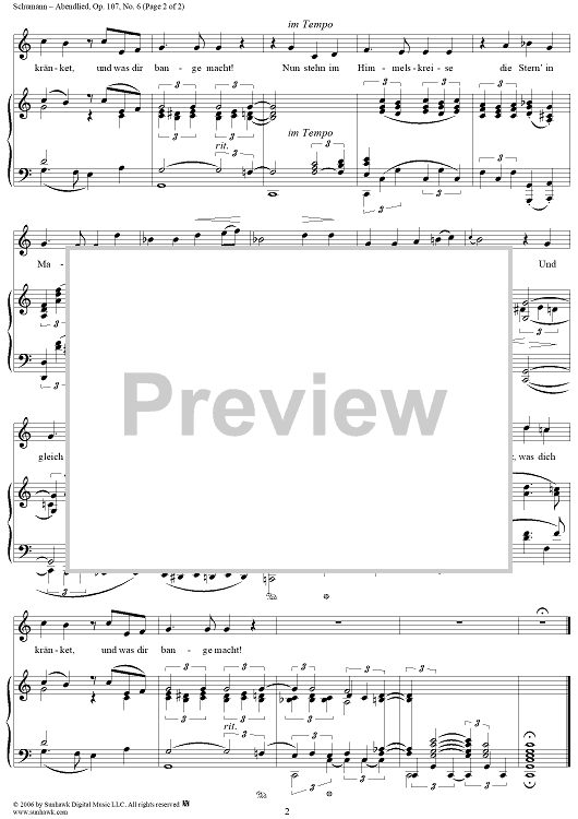 Digital Sheet Music for Abendlied, No. 6, Op. 107 by Robert Schumann, Robert Kinkel scored for Voice/Piano; id:318124